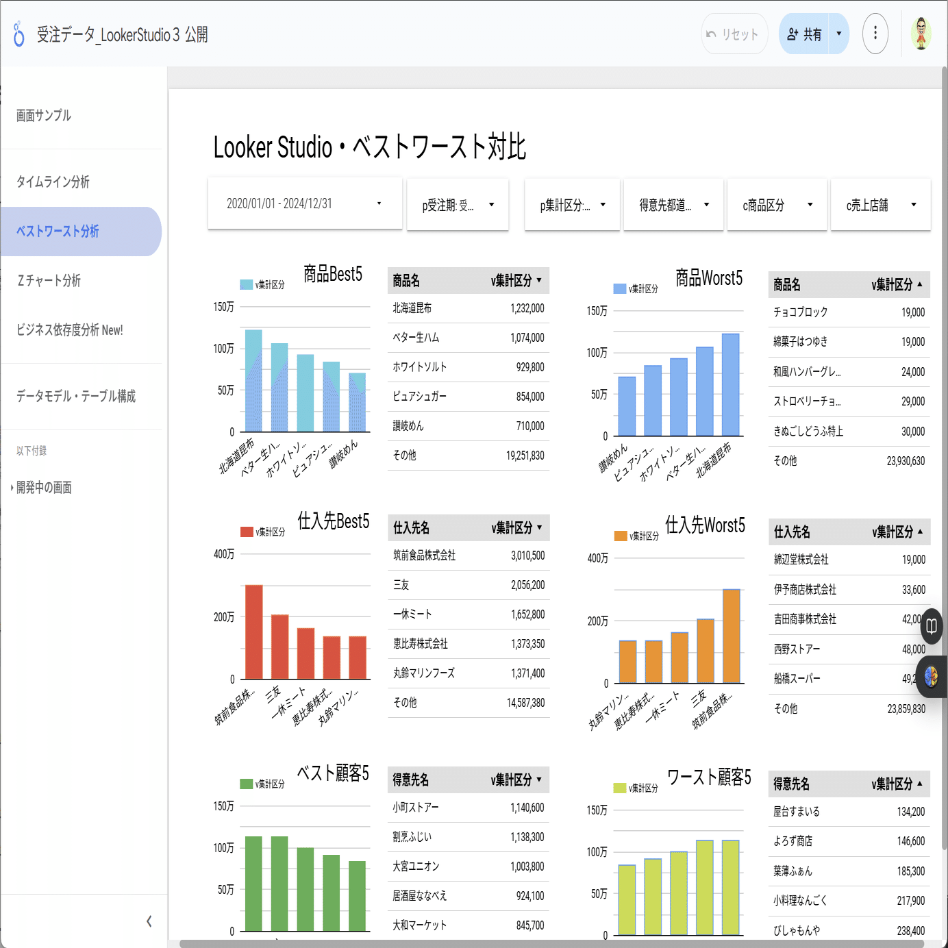 売上先別、商品別、商流別、仕入れ先別、担当者別…いくらでも準備はできます。そして重要だけれども存在しないデータは作りましょう。無料のLooker Studioに、販売データをつなげば、こうしたビューはすぐに作れます。